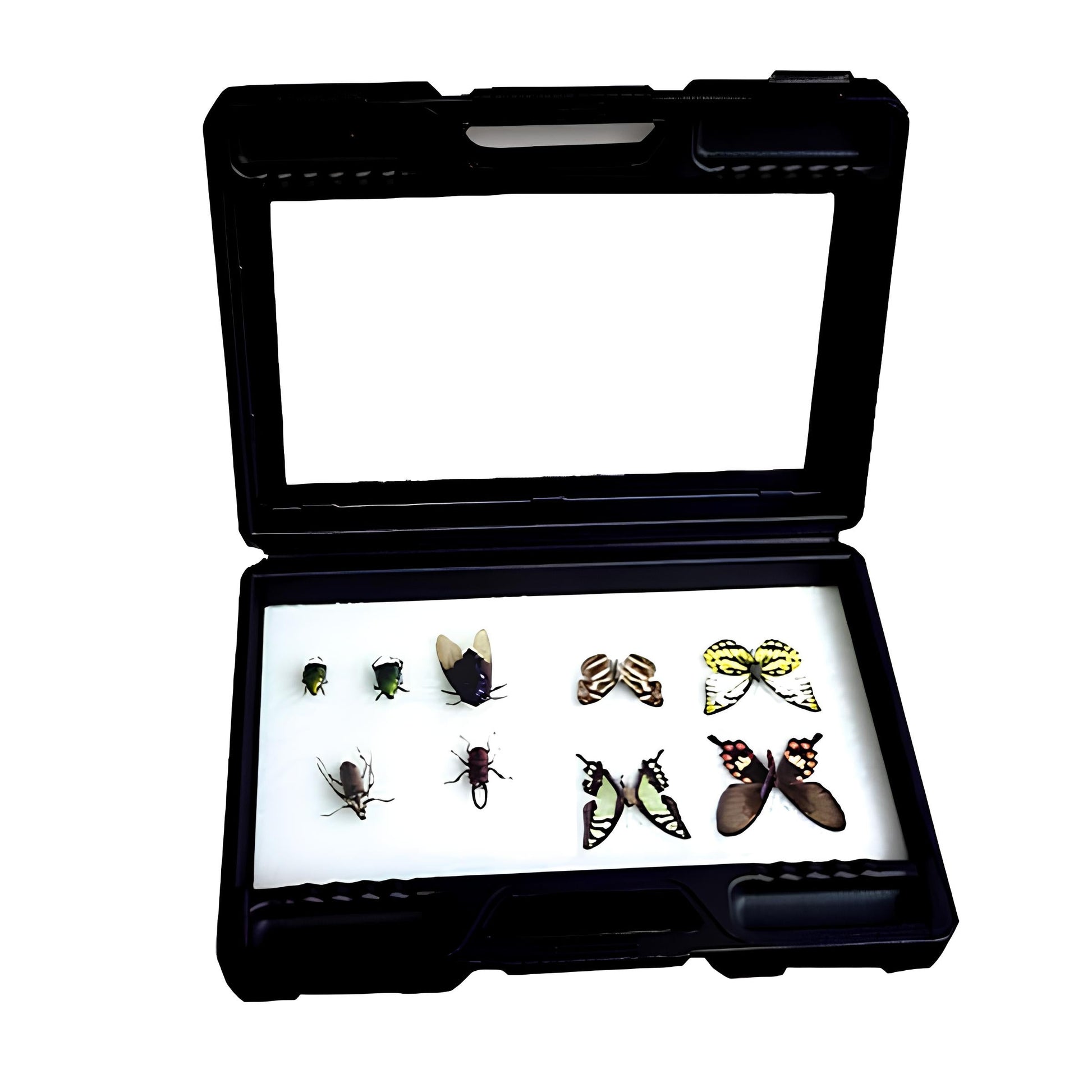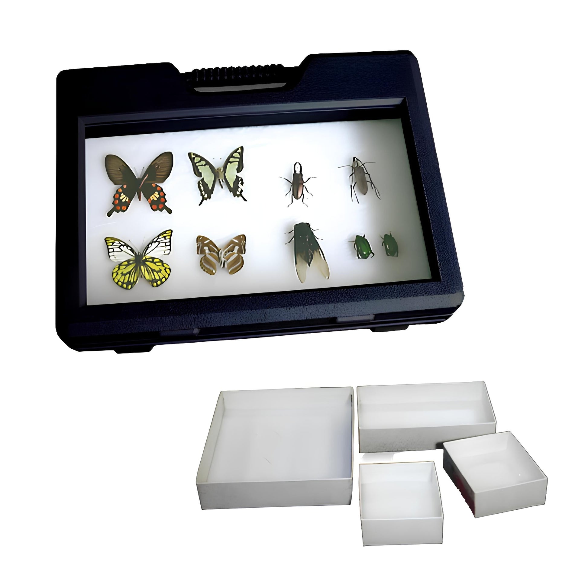 製好的標本應放入特製的標本盒中保存,保存於乾燥通風處,防止蟲蛀、發黴等問題破壞標本。避免陽光直射,以防標本褪色、脆化。本款標本盒為耐衝擊 PP 材質,一體成型,質輕且堅固耐用,上蓋具透明壓克力視窗,方便觀察。附有提把,攜帶方便。內部具樟腦放置凹槽,整體外徑:L410 × W310 × H90mm,內徑:L380 × W227 × H50mm。為台灣製造。