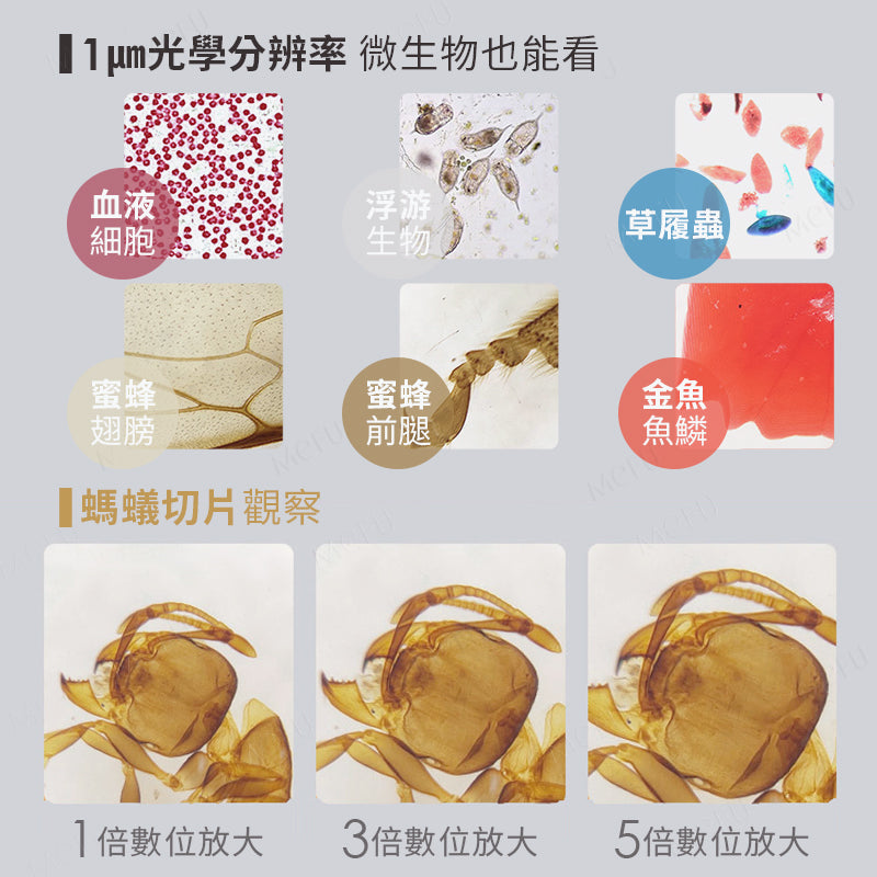 便攜式 可以看到1微米,400倍定(可調最低倍數),5倍數碼變焦(螢幕的放大倍數),放大面積400-1600倍,實際倍數20-100倍