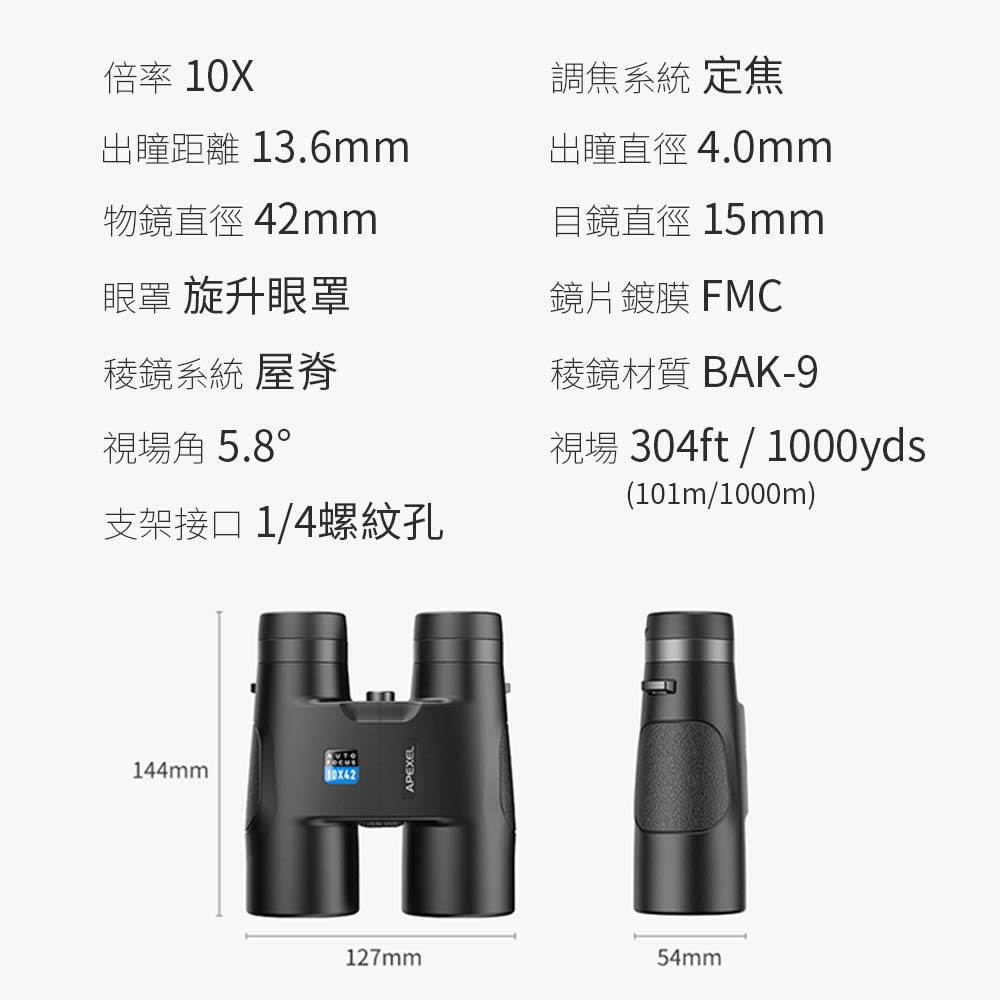 APEXEL 10X42自動對焦雙筒望遠鏡(APL-RB10X42A)《產品規格:》