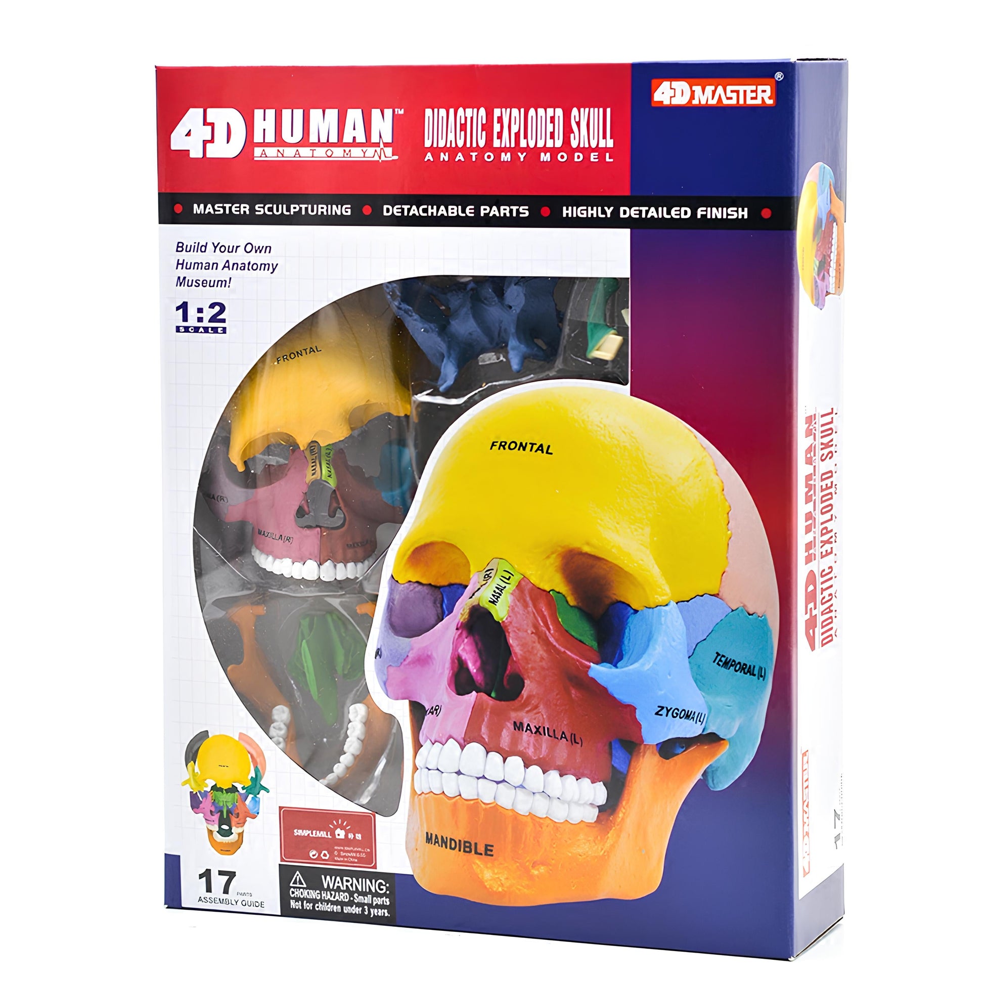 《4D彩色教學頭骨模型》,共含17個零件,展示人體頭骨原貌構造,每個零件都塗上不同顏色並印有他的英文名稱,附指導手冊。這款由許多塊立體零組件組成完整的模型,較傳統平面拼圖需要更多邏輯及立體空間概念思考,且有一定的組合順序有辦法完成 ,非常具有挑戰性!!