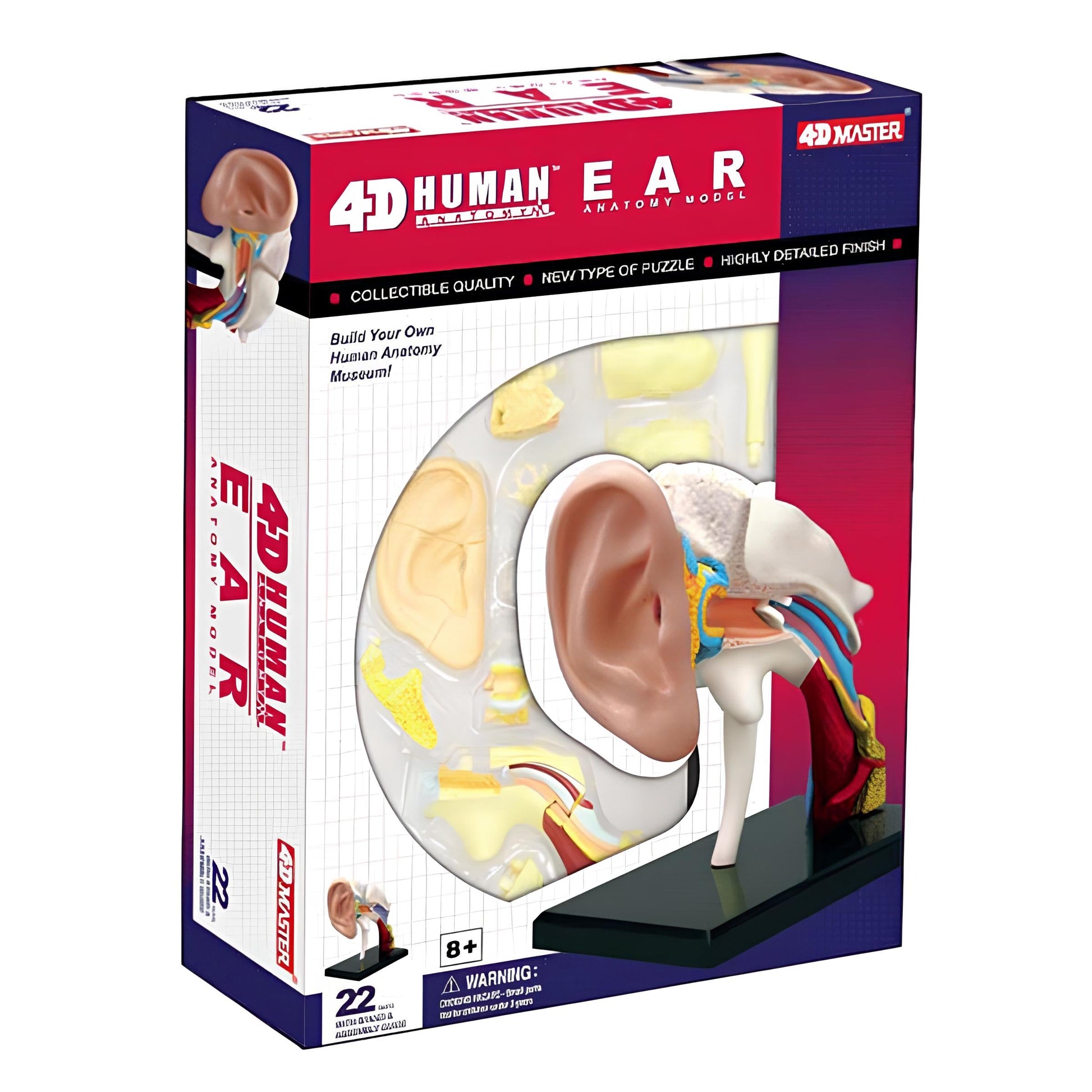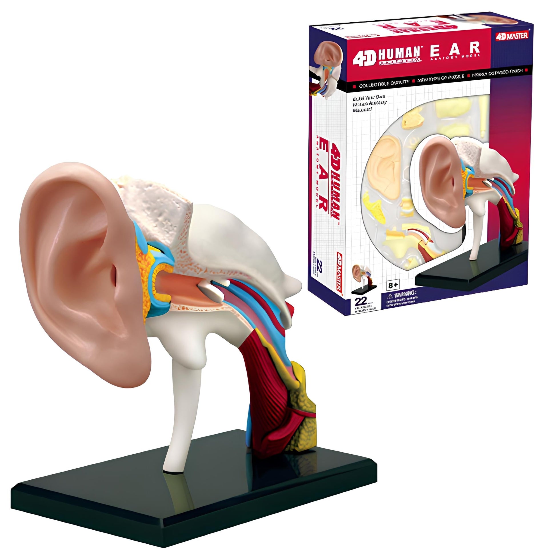 4D人體模型系列已榮獲部份國家 評選列入教育部的 教學教材 本系列產品是由全球知名的玩具製造商─香港 Fame Master 公司所研發製造。從2001年起,Fame Master 陸續推出一系列 4D Puzzle 教育性玩具。命名為”4D”是意指是長寬高 3 “D” imensions +Details(細部精細)的意思。模型參考實物比例製造,利用卡榫即可輕鬆組裝,高精密度及精確的色彩使造型栩栩如生。不但 降低了老師的教具成本,更活潑了學校的生物課程。這款《4D耳朵解剖模型》由22個部件組成,組裝完成後的總高度9cm,在動手拼裝之際,器官細部構造自然而然的烙印在腦海中,相當富有教育質量。