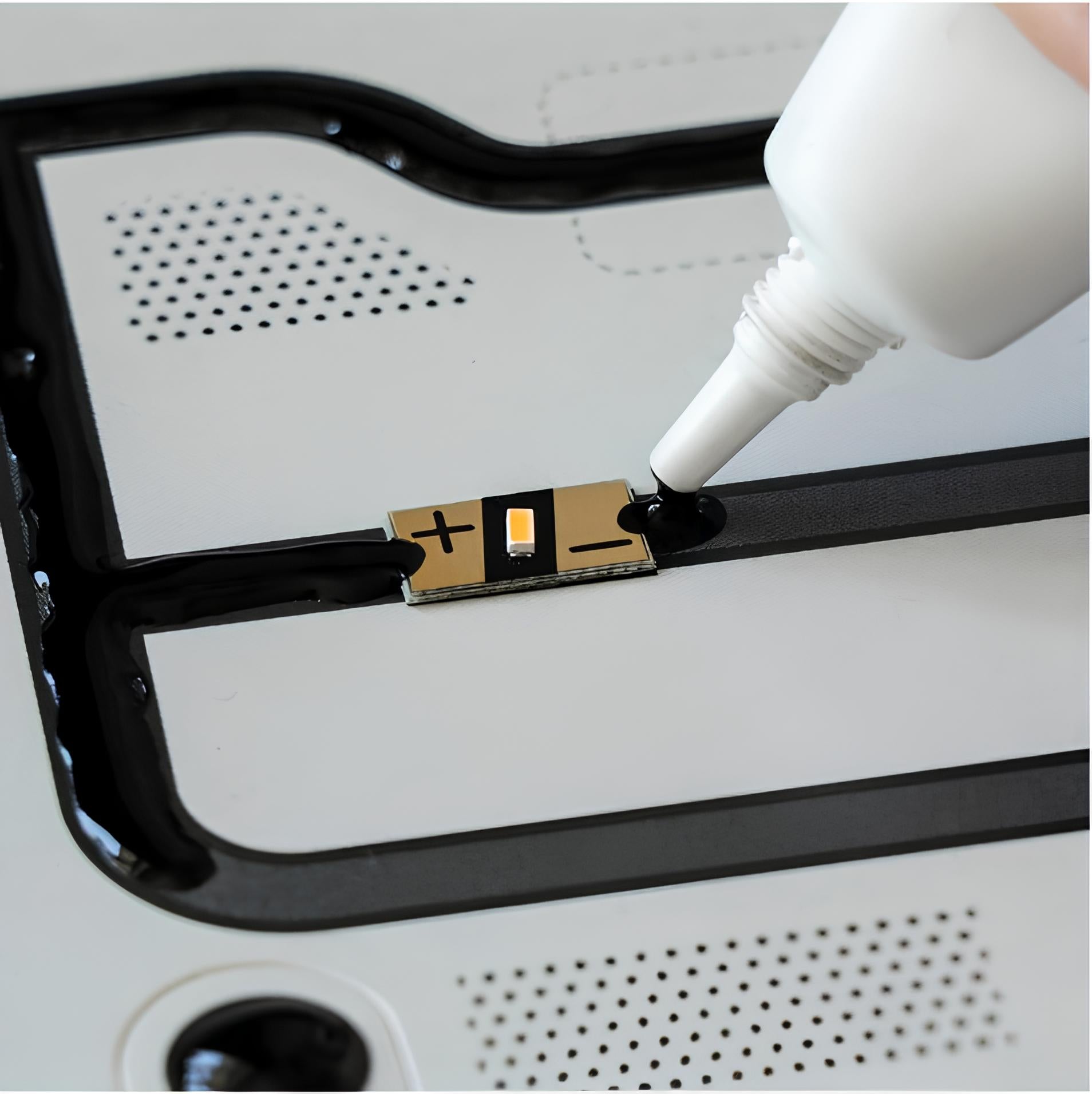 ELECTRIC PAINT導電漆,一種具導電效果的水基無毒油漆,使用油漆刷、筆刷、滾筒刷或網印技術即可上漆。 導電漆完全乾燥後,只要接上導電體,就可通電。更酷的是,它還可廣泛應用在紙張、塑膠、織品⋯⋯等眾多材料上。適合各式各樣的應用,包括 PCB 修復、電路/感應器上漆,以及冷焊。