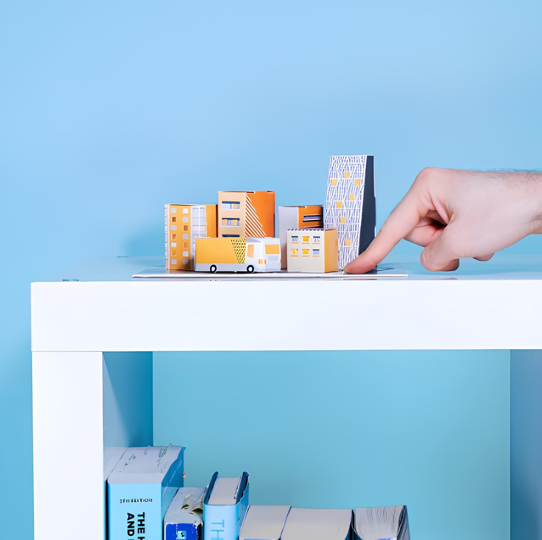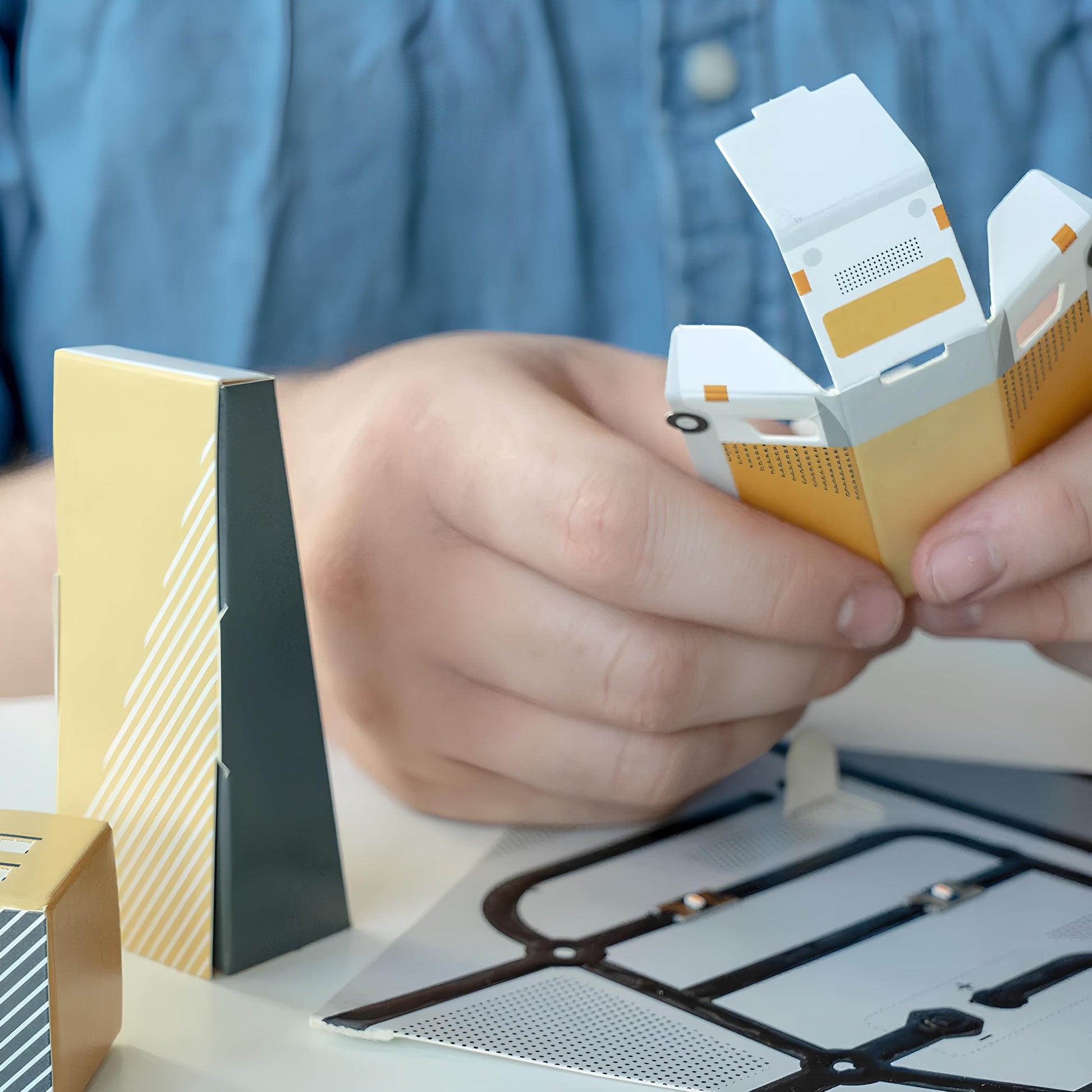 將模板摺疊出一座座城市景觀的建築。等電路完全乾燥後,您可以使用按鈕控制LED燈的開關,展示屬於你的電力城市街景。