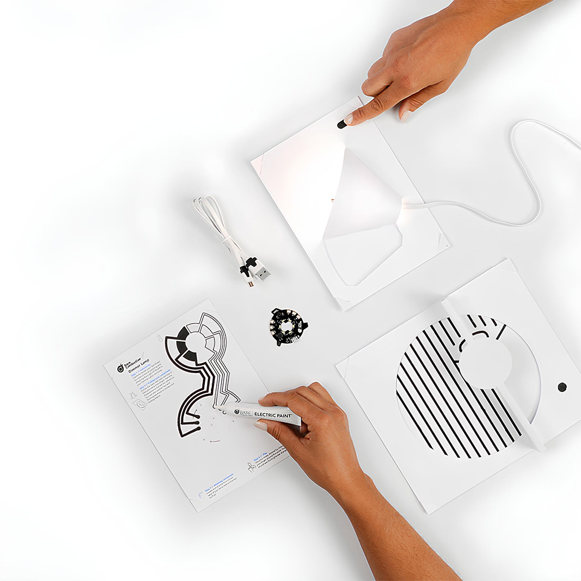 Electric Paint Lamp Kit 教你如何運用導電膠自由發揮創意,過程中無需任何工具、寫程式的知識或專業技能,只要簡單步驟,就可以自組出一盞你喜愛且獨特的檯/壁燈。