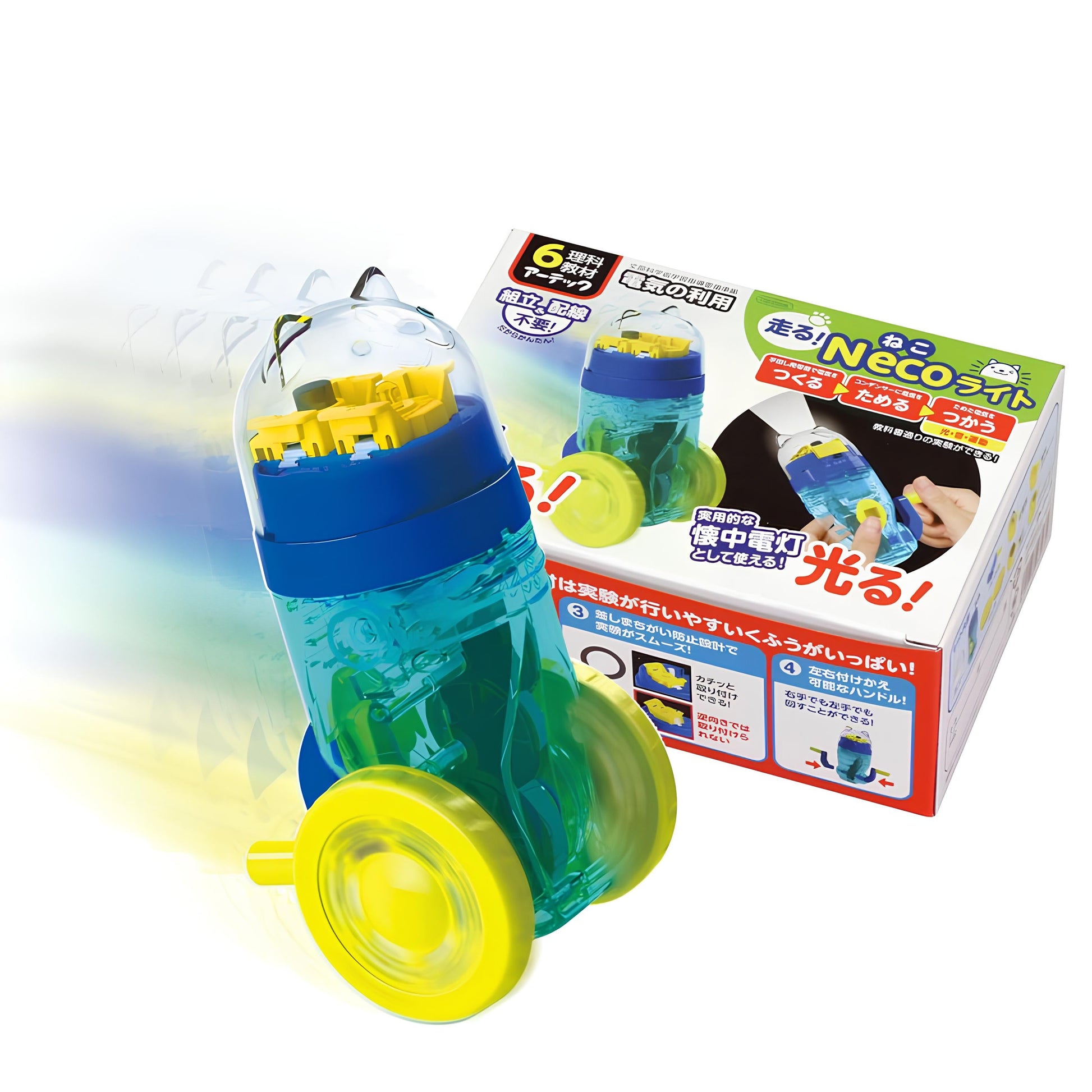 日本 Artec 出品的高品質科學教具。《貓咪手搖發電機》不只是外型活潑可愛的貓咪造型手電筒,透明外殼內藏著齒輪組和馬達。當你持續轉動把手產生動能,隨著齒輪組逐漸增速,帶動馬達的轉子轉動,就能利用感應線圈產生電能。接下來呢?接下來就可以裝上不同零件,玩出聲音、光線、運動等各式各樣的電力實驗遊戲囉!