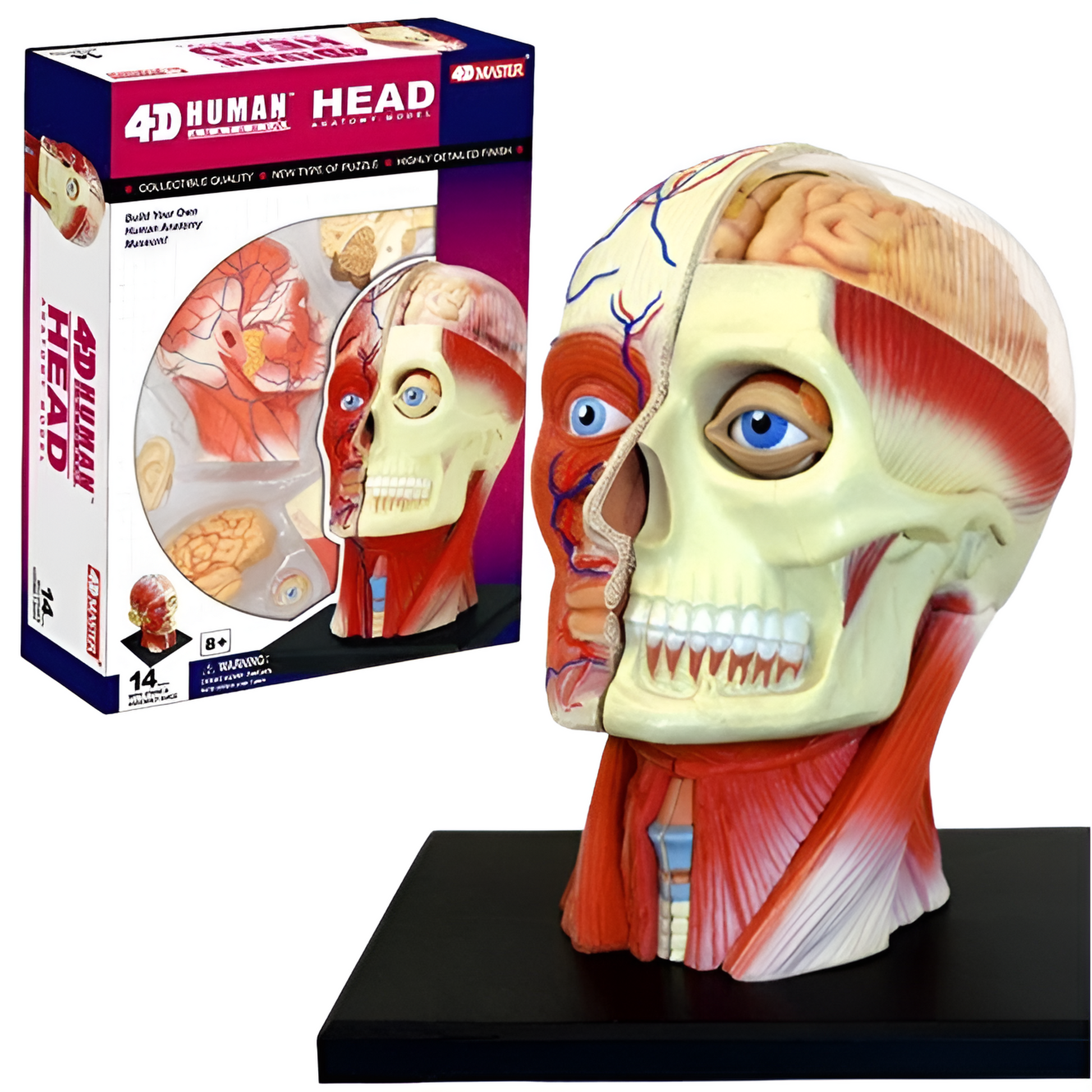 頭部是人體最重要的部位之一。頭部由顱和面部兩部分組成。顱內包含腦,面部有眼、耳、鼻、舌等感覺器官和消化系統的起始部位 嘴。瞭解頭部的結構與功能,讓我們更加清楚身體的狀態和狀況。人類的頭部結構組成都基本相同,但由於頭部大小、形狀以及面部器官形態的不同,使得人的面貌各不相同,表現出千差萬別的面部特徵。4D Human 這個頭部半解剖人偶有14件可裝拆組件,頭部細緻度以及上色都與實物非常雷同,想真度極高,如果想更認識自己的話可以入手這款產品,亦令你家裡的展品如同博物館般精彩。