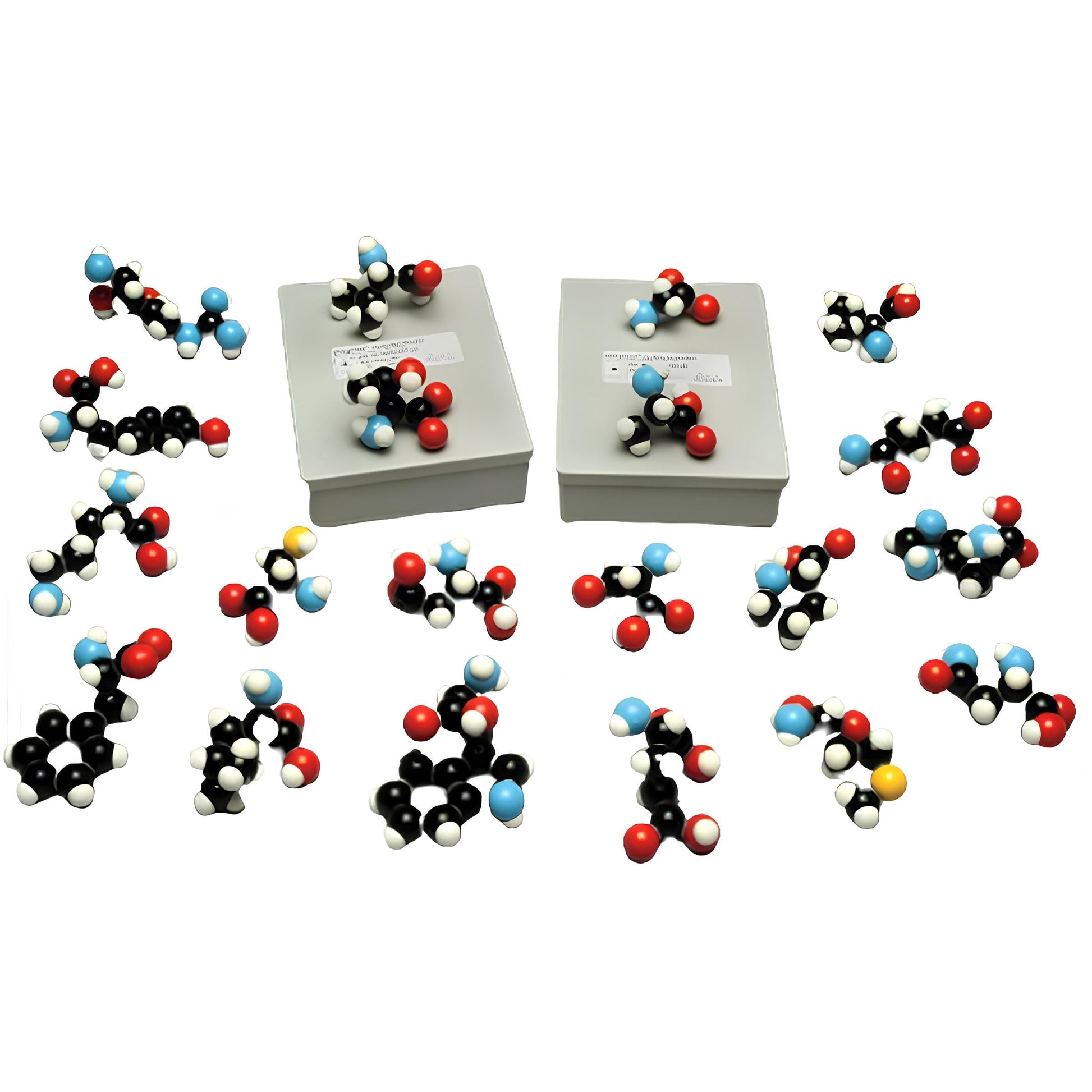 本組可組成 20 種胺基酸模型。胺基酸是蛋白質的基本單位,而蛋白質是生物體內最重要的活性分子。胺基酸的通式為H2NCHRCOOH,含有胺基 (-NH2)和羧基(-COOH),並且胺基和羧基都直接連接在一個(-CH-)。隨著 R 基團的不同,就可以組成性質不同的胺基酸。 本組內容如下: