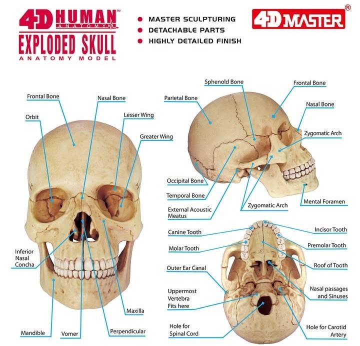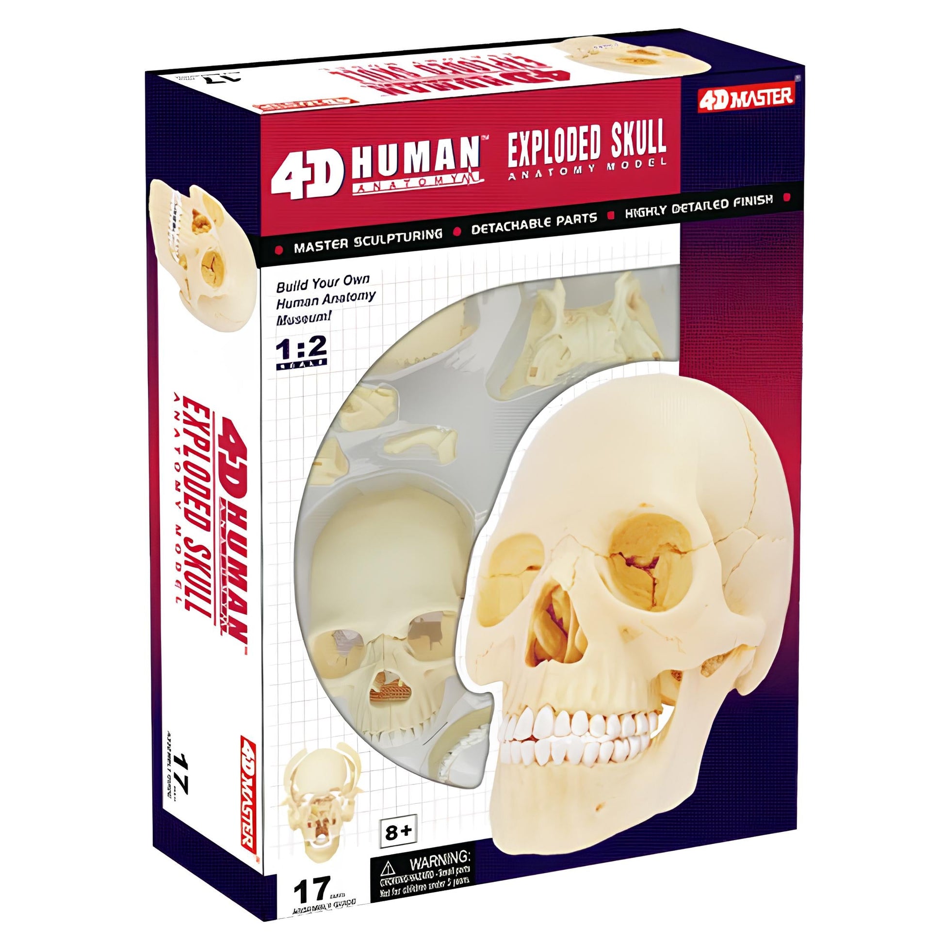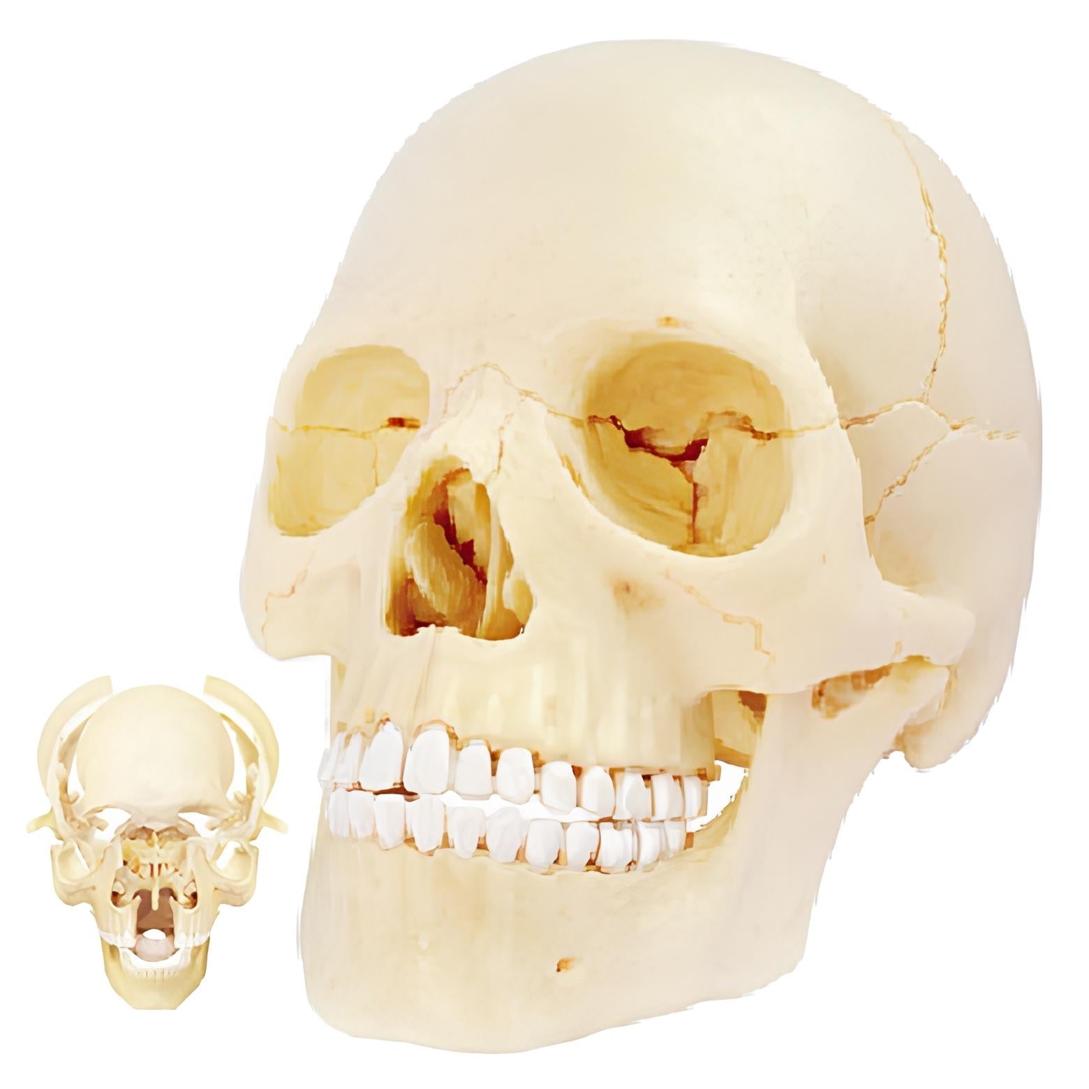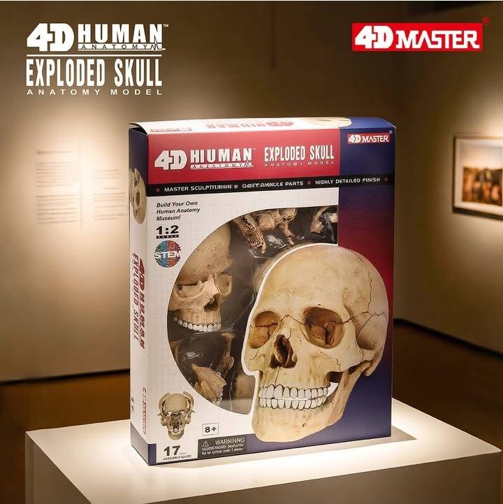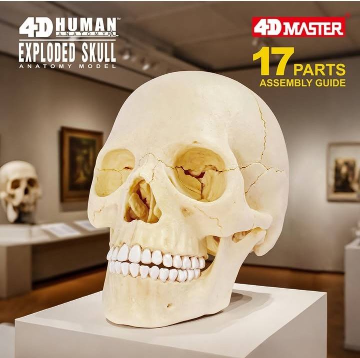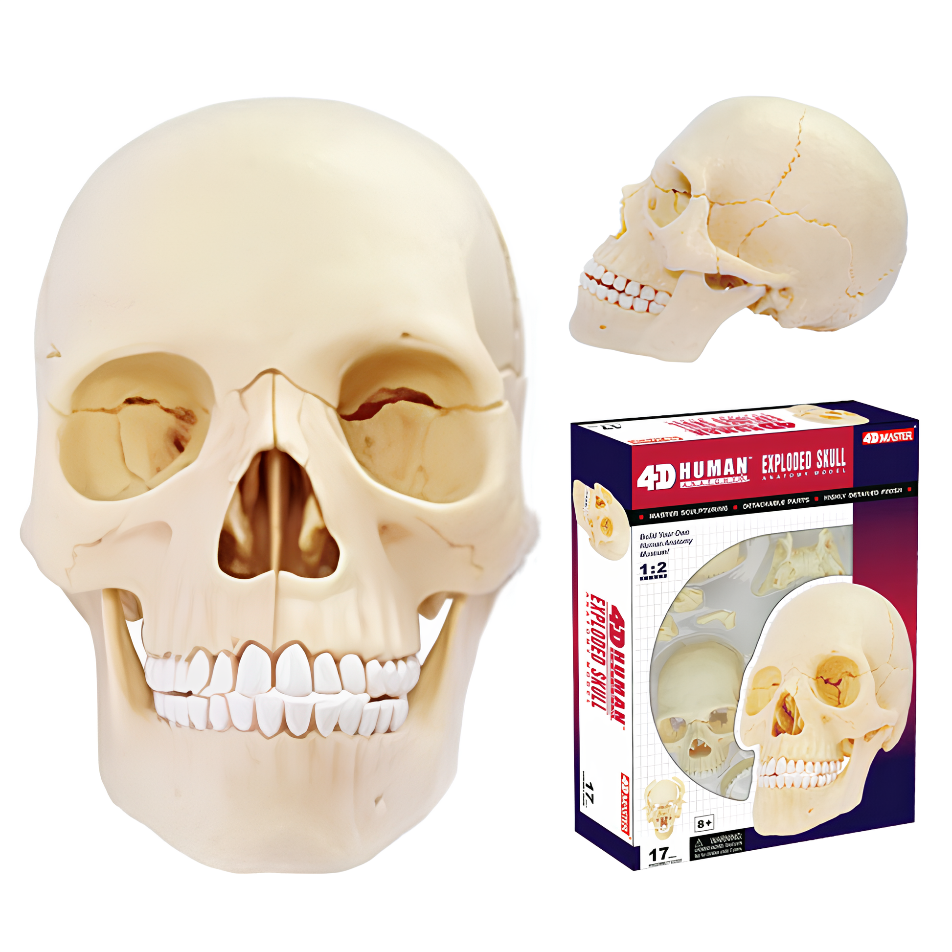成人頭骨由兩個胚胎起源不同的部分構成:腦顱部分稱為神經顱,是包覆大腦與腦幹的保護性骨質外殼;面部骨骼部分稱為臟顱/腹顱,由支撐面部的骨骼構成。《4D人體頭骨組合模型》,共含17個零件,展示人體頭骨原貌構造,附指導手冊。