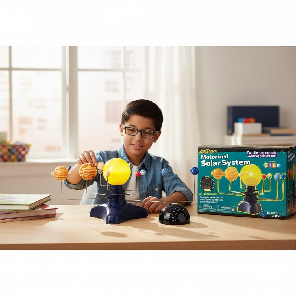 行星運轉的星象儀,可旋轉每個星球運轉的軌道及體驗太陽發光照亮每個星球的日照及黑夜白天形成的原因。需四顆C號電池(不含)。材質:安全塑膠。